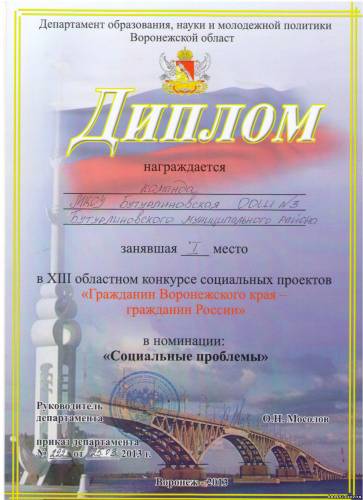 25 марта 2013 года команда нашей школы (Коржов Н.- 9класс, Маскаев Д.- 9 класс, Попов Д.- 9 класс под руководством классного руководителя Балакиревой О.С.) приняли участие в XIII областном конкурсе социальных проектов в рамках Всероссийской акции" Я-гражданин России" с проектом "Безопасная дорога в школу" в номинации "Социальные проблемы", который проходил в г. Воронеж. Номинация "Социальное проблемы" оказалась самой многочисленной, было представлено 8 проектов различной направленности. Задача конкурсантов -не только представить свой проект, но и суметь защитить его, ответив на многочисленные вопросы жюри и присутствующих. Старшеклассники отлично справились с этой непростой задачей-и 1 место в номинации "Социальные проблемы" присуждено нашему проекту "Безопасная дорога в школу". Победителям вручен диплом, благодарственное письмо и ценный приз. Поздравляем победителей! |